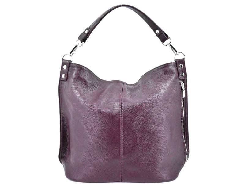 Dámská kožená kabelka, která zaujme svým tvarem. Vnitřní prostor kabelky je rozdělen větší kapsou na zip na dvě poloviny. Dále uvnitř najdete otevřené kapsičky na drobnosti a další kapsu na zip. Součástí kabelky je nastavitelný a odnímatelný popruh přes rameno. Poslední kapsičku na zip najdete na zadní straně kabelky. Kabelka je velmi prostorná a není problém do ní vložit formát A4
