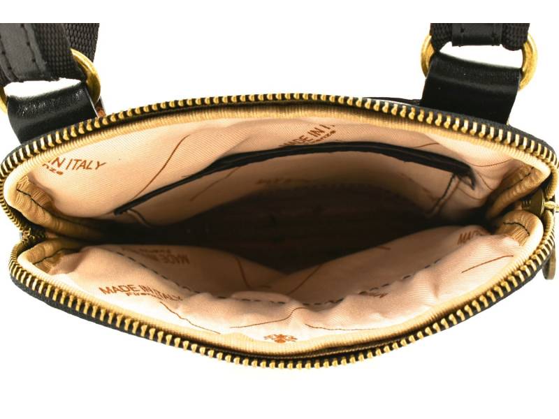 Kožená taška má nastavitelný popruh, takže si jeji majitel jednoduše nastaví jeho délku přesně tak, jak potřebuje. Vnitřní prostor je nedělený a po jeho stranách najdete otevřenou kapsičku na drobnosti a kapsičku na zip. Poslední kapsičku na zip najdete na zadní straně tašky.